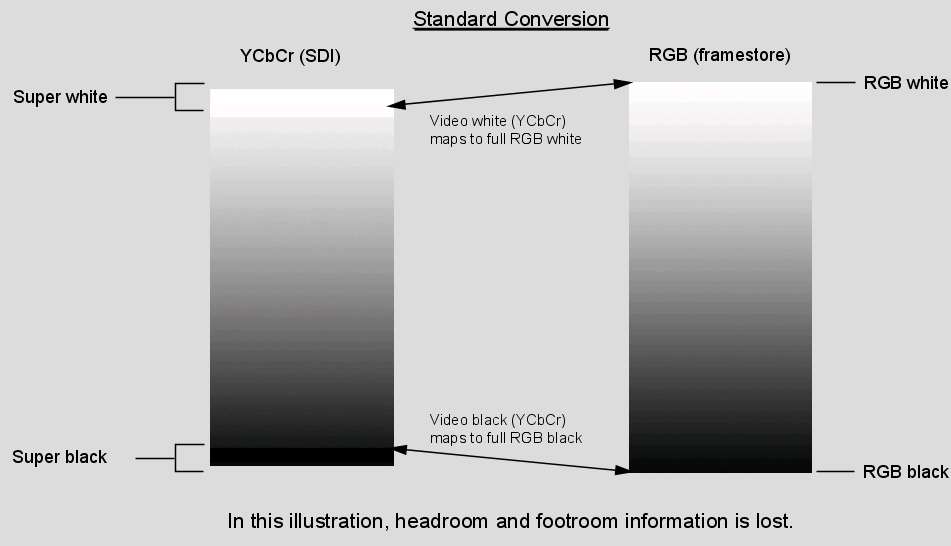 Some cameras record shadow details below the video luma black value of 64 and white detail above the video luma white value of 940. These details are called super blacks and super whites. These are also referred to as “headroom” and “footroom.” Under normal circumstances, headroom is not converted during capture, and the super black and super white details are lost, as described in the following illustration:
