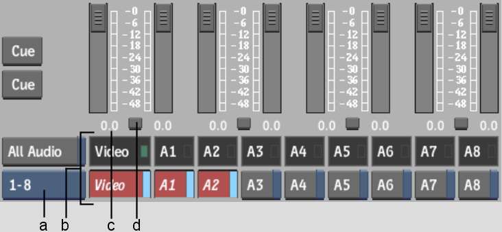 (a) Audio Tracks Toggle button (b) Channel Selection buttons and indicators (c) Audio Level fields (d) Fader Lock buttons