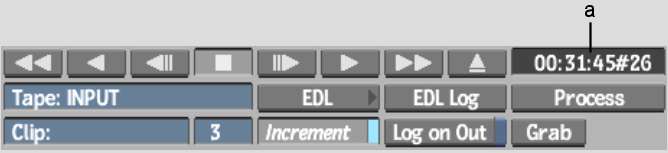 The current frame on the cassette in the VTR appears in the image window and the Current Timecode field (the uppermost timecode field in the Clip Input and Output menus) displays the timecode of the current frame.
