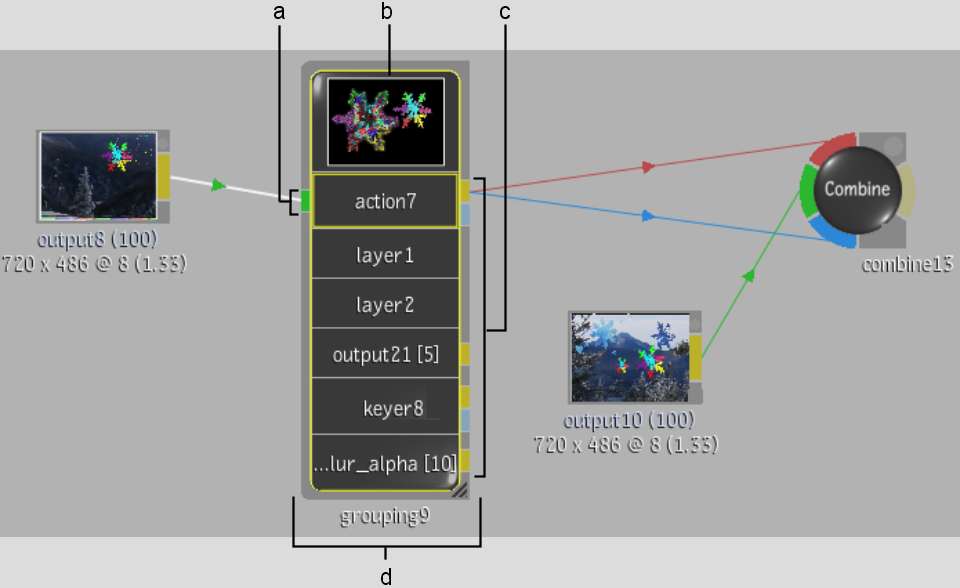 (a) Input connection (b) Proxy node (c) Output connections (d) Group icon