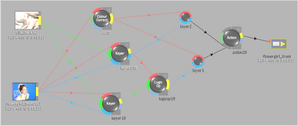 In the following example, the flowergirl_front clip is connected to the Front tab of a Colour Correct node and two Keyer nodes. The silk_back clip serves as the back for both Keyer nodes and the Action node. The result of the Colour Correct node is connected to two Action media nodes, one of which has a Logic Op node result feeding into it. Finally, the entire process tree feeds into one final output.