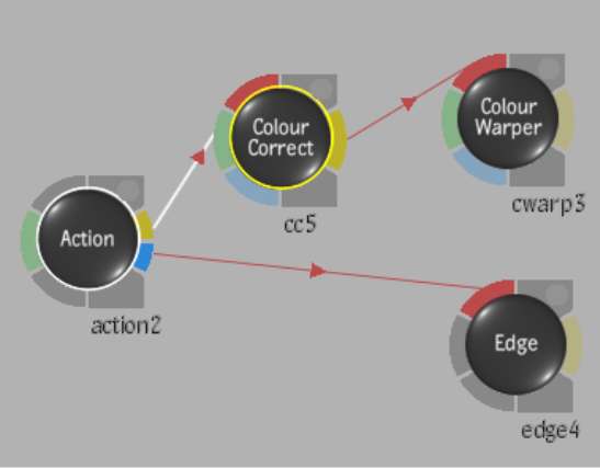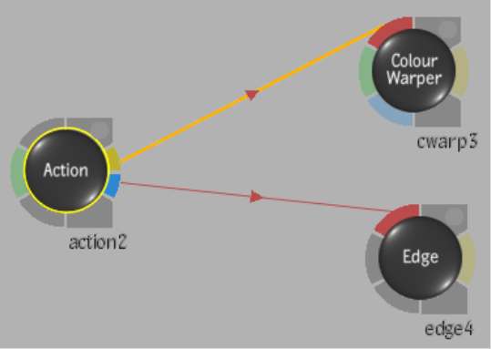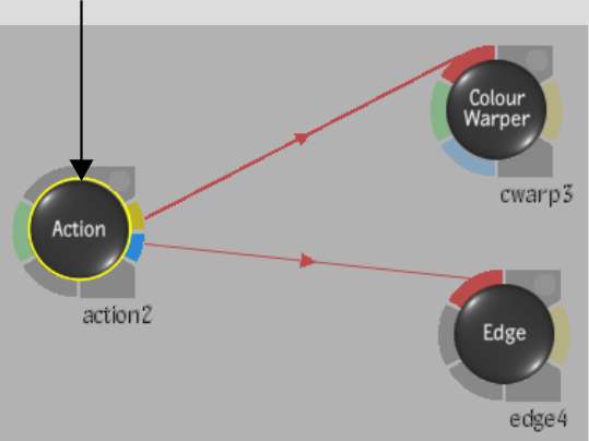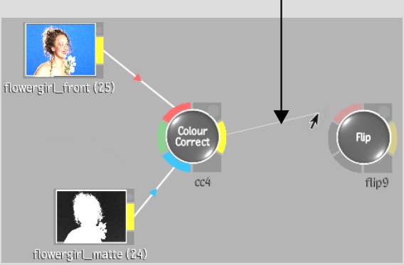An arrowed line is drawn from the node to the source tab. For example, click the Result tab of the Colour Correct node and drag the cursor to the front tab of the Flip node to flip the result of the colour-corrected clip.