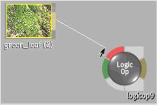 To connect nodes, you use the coloured tabs on the node's left side; these tabs are called source tabs. The colours of the source tabs correspond with the cursor colours when selecting clips from the EditDesk . The yellow tab on the node’s right side is called the Result tab. You use the Result tab of a node to connect its result to the front, back, or matte tab of another node.
