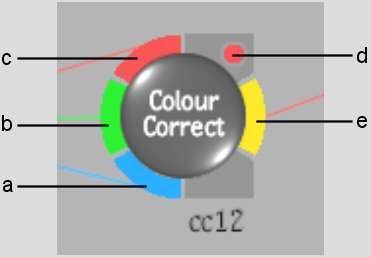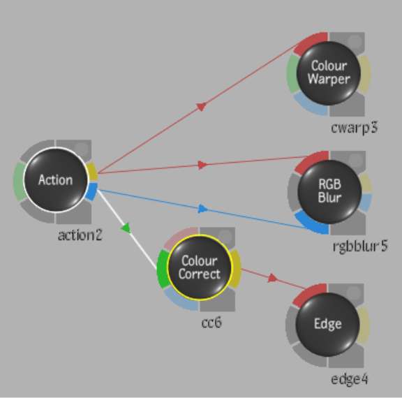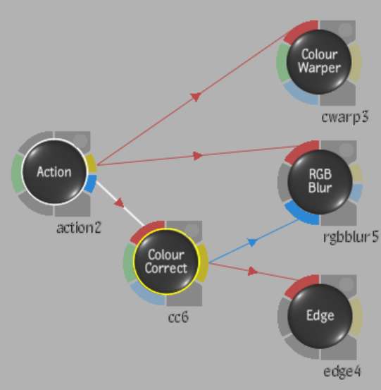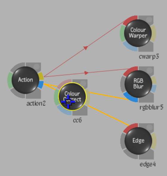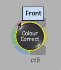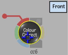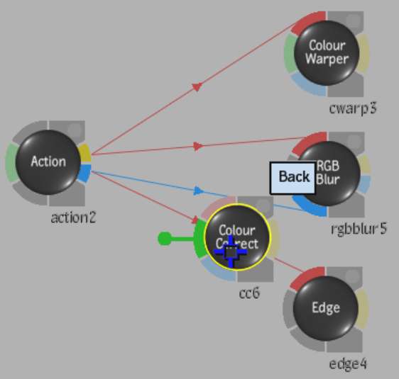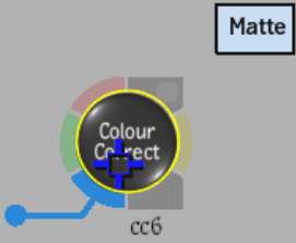 For example, while pressing and holding Shift and dragging a Colour Correct node, pressing Alt once displays an extended red arm from the Front tab. Pressing Alt again displays an extended green arm from the Back tab; and pressing Alt a third time displays an extended blue arm from the Matte tab.