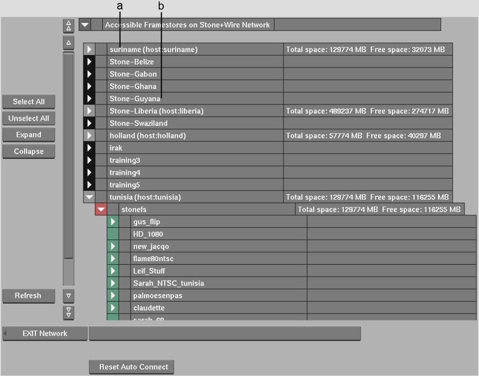 Expand and Collapse buttonsClick Expand to expand selected entries. Click Collapse to collapse selected entries. When you click the Expand button beside a framestore entry, the host machine is shown in parenthesis.