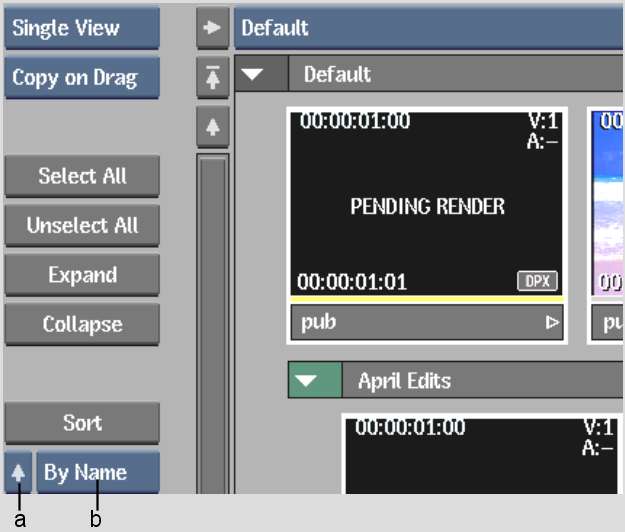 You can sort entries in clip libraries in Titles and Proxies mode using the Sort button or the Name and Date Sort arrows. Sorted entries of the same type are grouped together. For example, clips are grouped together and Source and Record Areas are grouped together. You can sort all entries or top-level entries only. See Sorting Clips in List View.