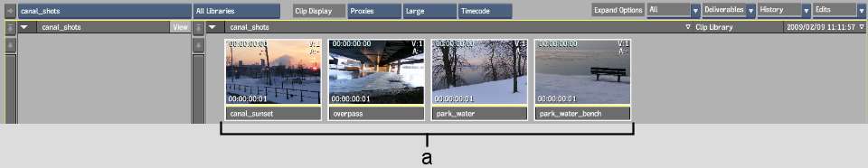 Open a clip library from the EditDesk or from the current library. You can open any library belonging to the current project. If you accessed libraries through the network panel, you can also open libraries belonging to other projects.