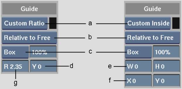 (a) Aspect Ratio box  (b) Relative box  (c) Overlay Type box  (d) Y Offset field (e) W, H fields  (f) X, Y Offset fields  (g) Ratio field