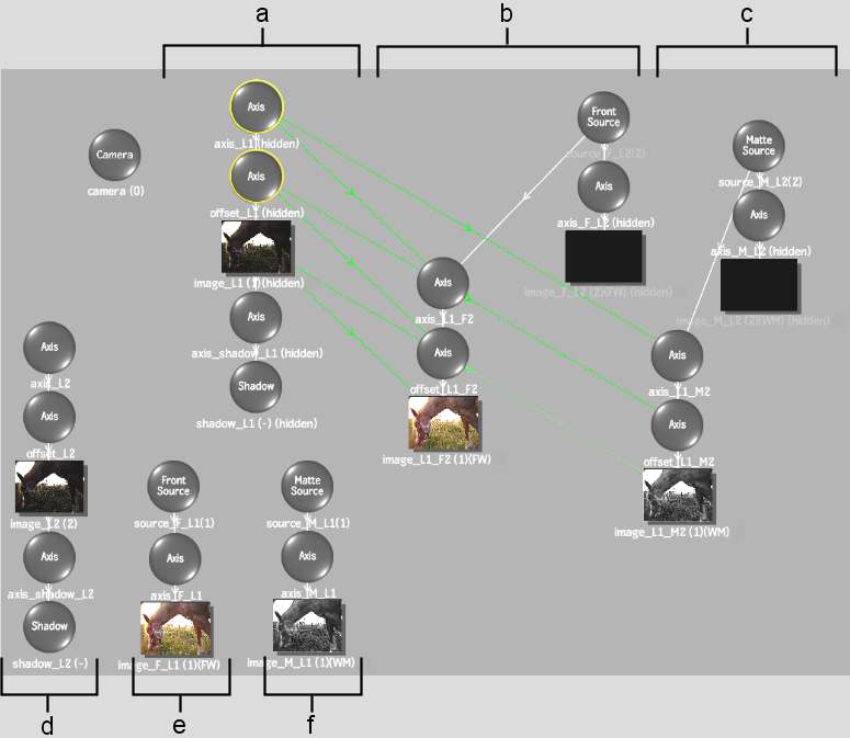(a) Hidden DVE_L1 branch with duplicate links  (b) Front Source branch of DVE_L2  (c) Matte Source branch of DVE_L2  (d) DVE_L2 branch  (e) Front Source branch of DVE_L1  (f) Matte Source branch of DVE_L1