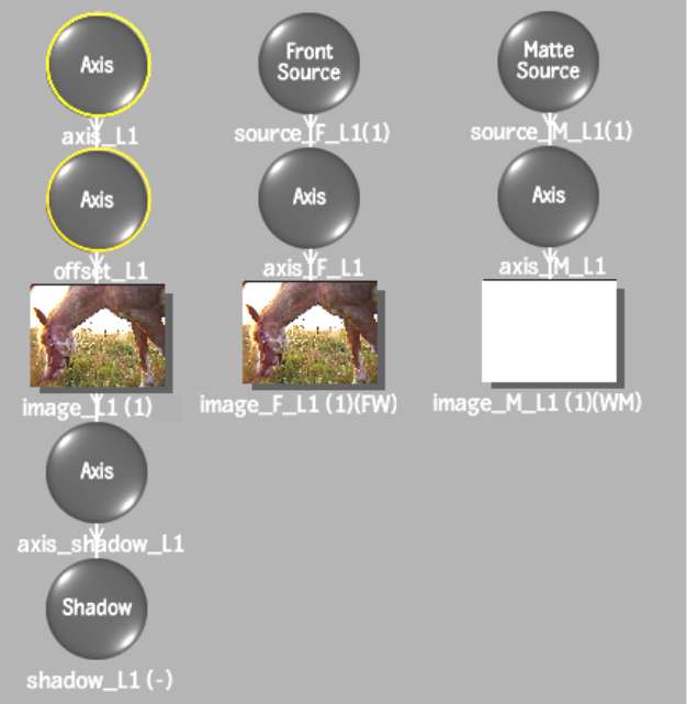 The Front Source branch includes an image node in front-white mode, while the Matte Source branch contains an image node in white-matte mode. By default, Z-buffering is set to Off for DVE Layer Object source nodes to preserve the higher priority of the original matte or front objects. Source nodes inside DVE Layer Objects also use the general anti-aliasing sampling level and softness from the Action Setup menu.