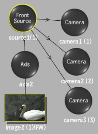 You can add multiple cameras under a parent source node to change the point of view (by orbiting to a different orientation, for example). Camera 0 is always the default camera in a scene (you may need to pan in the schematic to see this camera).