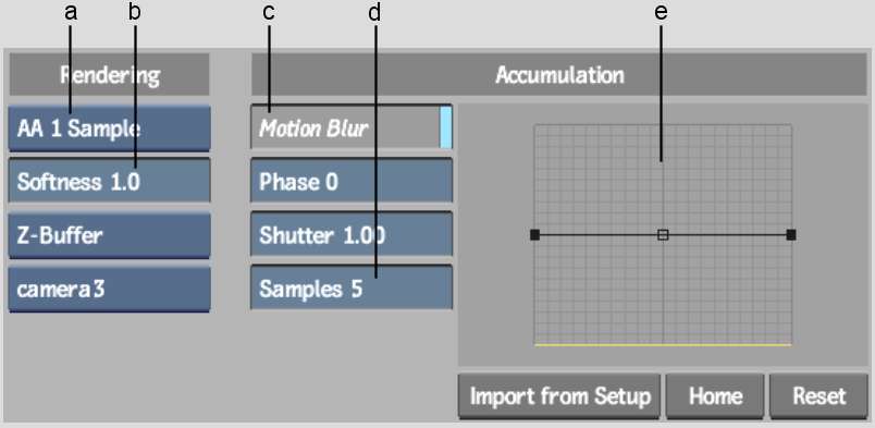 (a) Anti-Aliasing box  (b) Anti-Aliasing Softness field  (c) Motion Blur button  (d) Samples field  (e) Motion Blur Curve