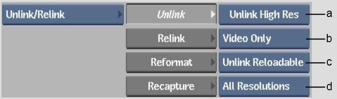Unlink Reloadable Unlink the media only from clips whose media can be recaptured or reimported and relinked to the clip. Clips created in effects modules are not unlinked.
