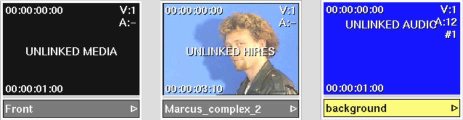 The media of clips processed in modules cannot be relinked to the clips; the same applies to hard-committed clips. In these cases, the media is flagged as un-reloadable. When unlinking from the Tools menu, you can unlink only the material that can be recaptured or you can unlink all media (including the clips processed in effects modules).