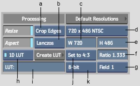 (a) Fit Method box (b) Resize Filter box (c) Frame Width field (d) Resolution Presets box (e) Frame Height field (f) Aspect Ratio field (g) Scan Mode box (h) Colour Correction Type box (i) LUT Name field (j) Aspect Ratio Presets box (k) Frame Depth box