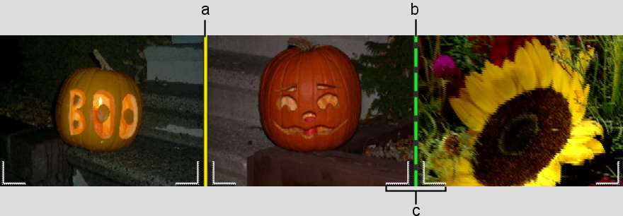 When you view a clip in the Record Area, information on each element of each clip indicates transition handles. In Storyboard, Head/Tail, or Frames view, transition handles mark the focus point of a transition from one clip to the next. A yellow bar indicates a non-blending transition such as a cut on a focus layer. A green dotted bar indicates a blending transition such as a dissolve or wipe on a focus layer. In Frames view, green brackets also mark the start and end of a blending transition. For more information, see Identifying Cuts and Transitions.