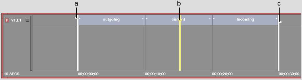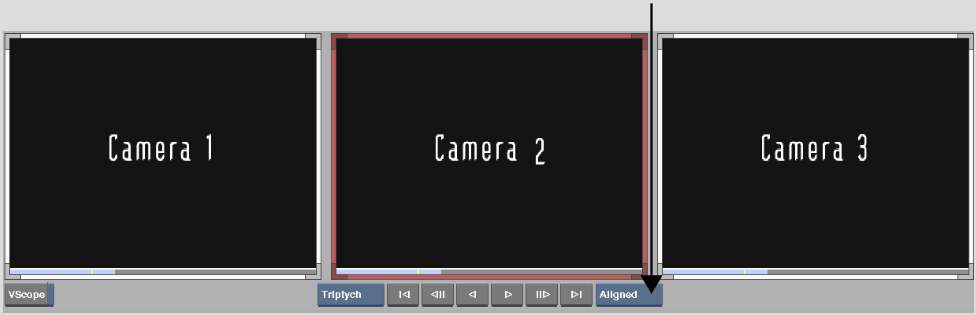 In Timeline view, three positioners appear, one for each Triptych Player window. In Free mode, each Triptych Player window has its own transport controls. In Lock or Aligned mode, only the centre Triptych Player window has transport controls. You can use Free mode to move each positioner independently, or Lock or Align mode to move all positioners simultaneously.