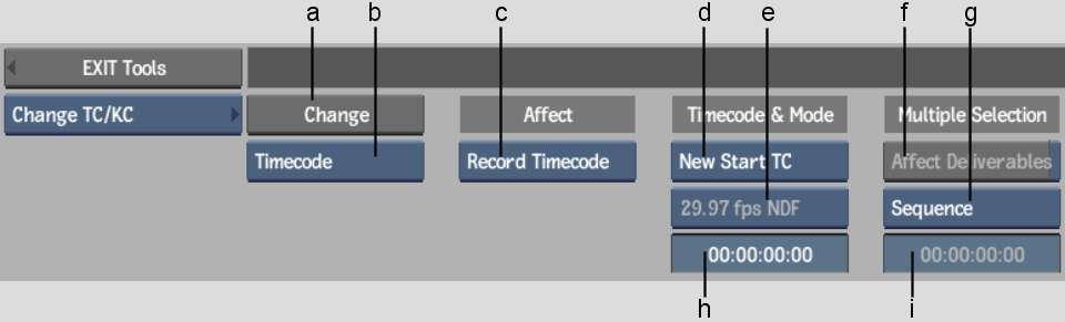 (a) Change button (b) Timecode/Keycode box (c) Change Target box (d) Change option box (e) Frame Code Mode box (f) Affect Deliverables button (g) Timecode option box (h) Start Timecode field (i) Step Timecode field