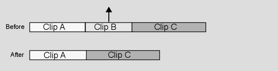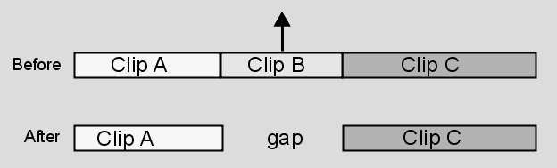When you remove an element from an edit sequence gesturally, the effect depends on whether Ripple is on or off. When Ripple is off, you lift an element, leaving a gap in place of the lifted element.