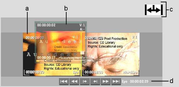 (a) Clip to be replaced (b) Source clip (c) Ripple replace cursor (red) (d) Duration of sequence before ripple replace (00:00:02:29)