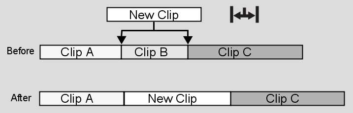 In the following illustration, New Clip replaces Clip B. As New Clip is longer than Clip B, everything after Clip B is moved ahead to accommodate the duration of New Clip.