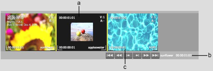 (a) Source clip  (b) Duration of sequence after overwrite (c) One frame of clip is overwritten by source clip (00:00:01:03)