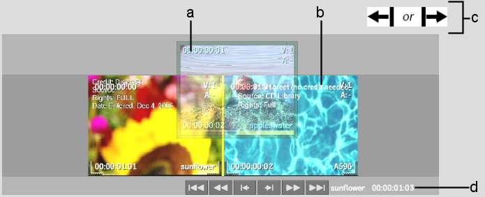 (a) Source clip (1 frame)  (b) Clip beneath cursor (2 frames)  (c) Overwrite cursors (green)  (d) Duration of sequence before overwrite (00:00:01:03)