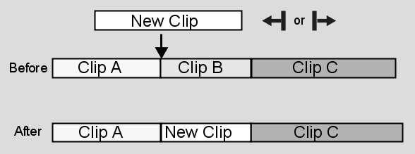 When you overwrite existing material in the record clip with new material, the overall length of the record clip does not change. The result of the overwrite edit depends on how you perform the edit. In the following illustration, New Clip is edited gesturally at the transition between Clip A and Clip B. Clip B is overwritten. Clip A and Clip C are unaffected.