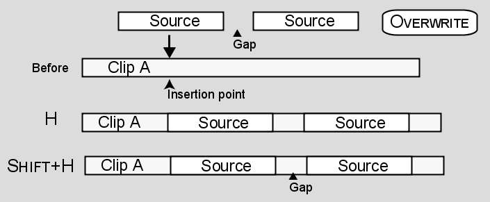 NoteIf you have a multi-layer source clip with a gap on one of its layers and you want to fill the gap with the media on the corresponding layer, you can also press H or click Overwrite.