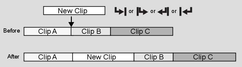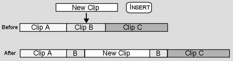 The following illustration demonstrates the result of inserting New Clip at a frame in the middle of Clip B. Every frame after the edit point is moved ahead to accommodate New Clip.
