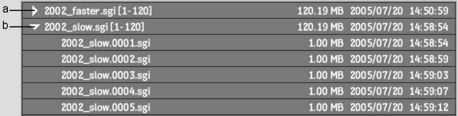 Expand and CollapseUse these items to expand and collapse groups of files in the File list. For example, a series of images can be grouped (collapsed) into a single entry in the file browser. These buttons correspond to the expand and collapse arrows that appear in the File list.