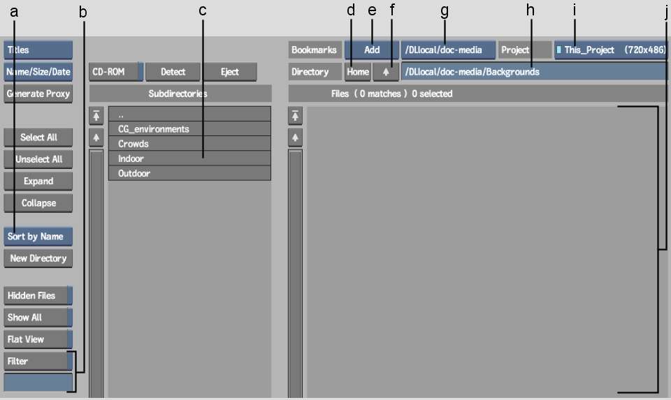 (a) Sort box (b) Filter tool (c) Subdirectories list (d) Return to home project directory (e) Add/Delete Bookmark (f) Go to Parent Directory (g) Bookmarks list (h) Directory box (i) Project box (j) File list