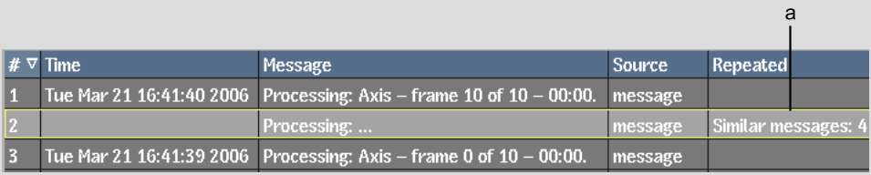 To prevent too many messages from being displayed, the log identifies identical messages instead of listing each one separately. It also identifies messages that are similar. For example, the first and last frames of a processing operation are listed as two separate messages. Since all the frames processed in-between are treated as similar, they are grouped into one processing message.