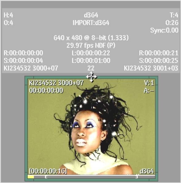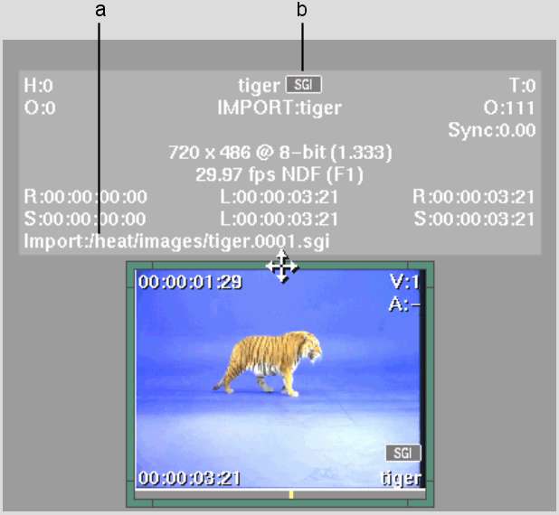 Source Area clip proxies and timeline segments contain information on the clip or segment such as the name and length in frames or timecode. The amount and type of information that appears depends on the option you choose in the Clip Information box found in the General section of the Preferences menu and in the Source Area menu bar (see General Preferences). The frames in a clip are numbered sequentially using either frame numbers or timecode (depending on which you choose to display). Timecode is always read from left to right, in hours, minutes, seconds, and frames.