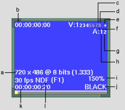 (a) Resolution, bit depth, and aspect ratio (b) Current frame number, timecode, and/or keycode (c) Video track in the clip: large font indicates the Primary track (d) Video track: small font indicates non-Primary tracks (e) The “+” means there are more than eight tracks (f) Audio and Video: grey text indicates locked tracks (g) Audio: small font indicates tracks not assigned to output channels (h) Audio: large font indicates tracks assigned to output channels (i) Speed indicator: appears if speed is other than 100% (j) Clip name (k) Duration (l) Framerate and Scan mode