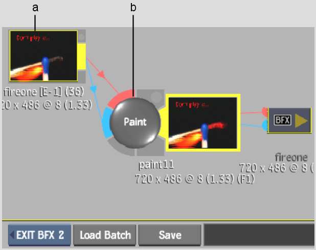 Creating Batch FX is an iterative process. You can apply a Batch FX to a segment in any Batch level. In the following example, the segment with the Text soft effect is brought into a new setup (BFX 2) with the Post option. A Paint node is applied to the clip and its Text soft effect.