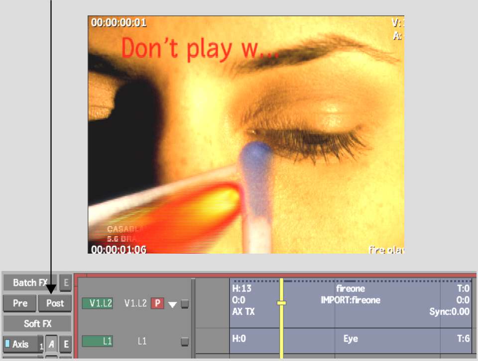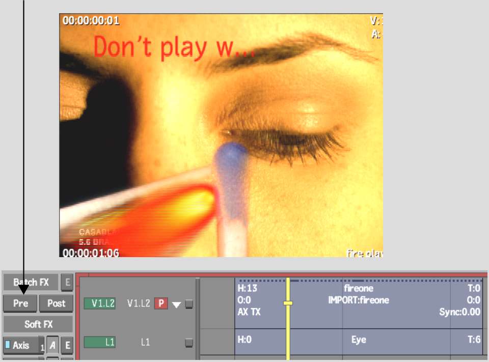 To apply a Batch FX to a source and not its soft effects, you enter a BFX level with the Pre option. You can enter with only one segment. Bring in only a source to make changes such as removing pulldown that you want to do before the soft effects. When you go back to the EditDesk record timeline, the soft effects are reapplied to the modified source.