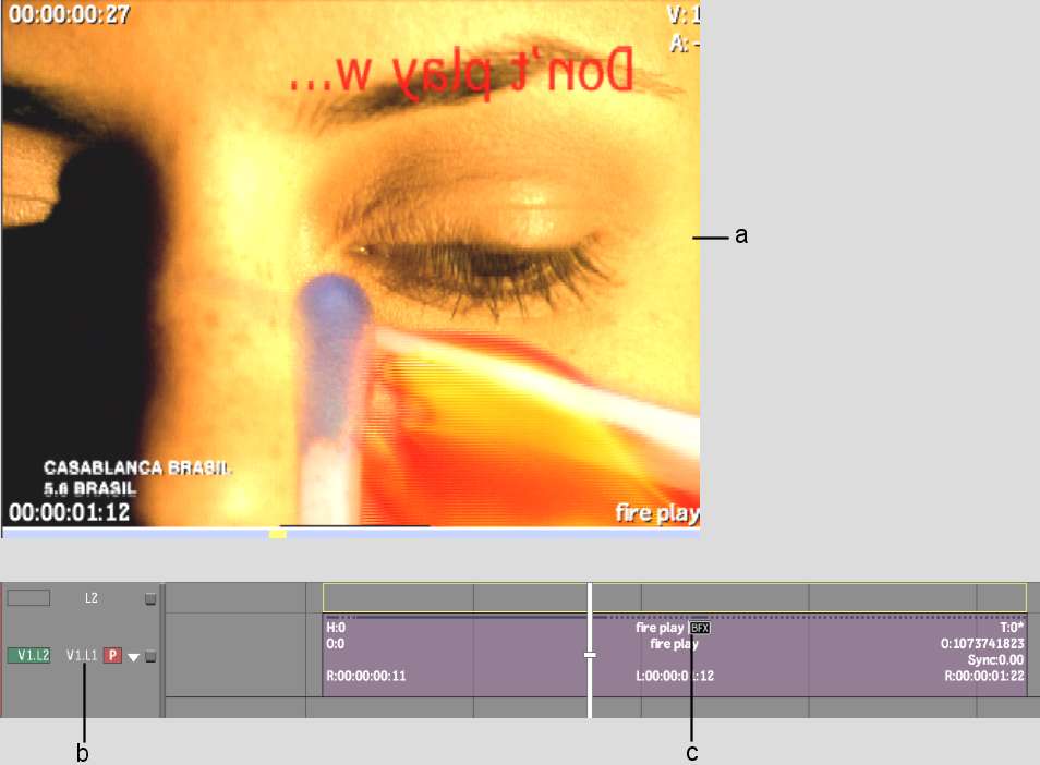 (a) Selected clip (b) Axis and Text soft effect indicators (c) In and out points on clip layers