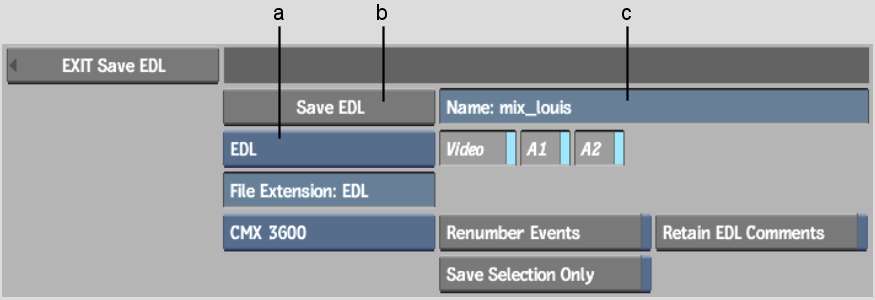 (a) EDL Format box (b) Save EDL button (c) Name field