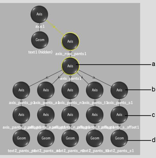 Rather than create a separate pivot point for each letter, you can separate words or sentences so that each letter can be individually manipulated by its own axis in the schematic.