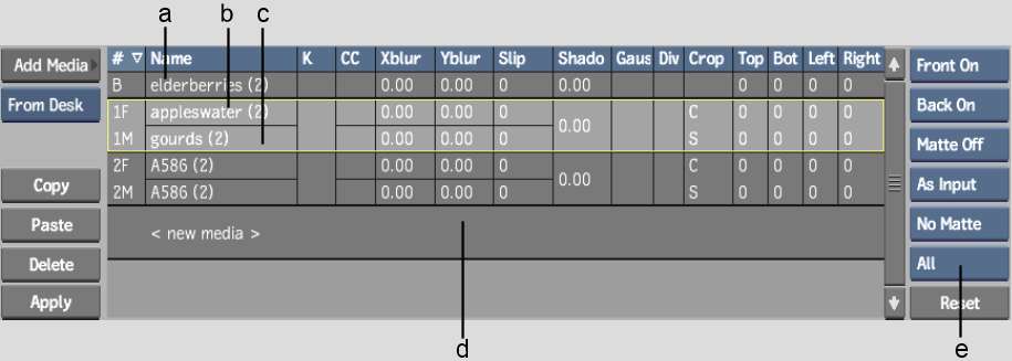 The clips that you load for each media appear in the Media list. The back clip you selected to access Action appears in the first row of the Media list and is assigned the letter B in the # column. The second row in the Media list contains the first front and matte clips you selected when accessing Action. The length of each clip appears in parentheses beside the clip name. A new line is added to the Media list each time you add media.