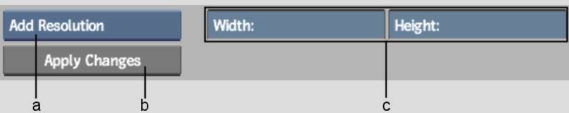 (a) Add Resolution box (b) Apply Changes button (c) Width and Height fields