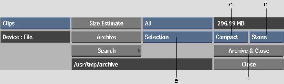 (a) Library Type box  (b) Clip Library box  (c) Backup set box  (d) Archiving Mode box  (e) Entry Type box  (f) Archive & Close button