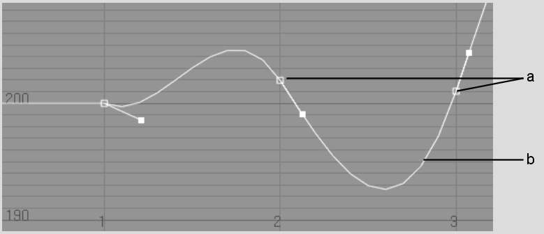 Each keyframe has two components: a value for the channel and the frame where the value is set. Keyframes are plotted on an animation curve in the Channel Editor. This curve maps frame numbers on the horizontal axis and channel values on the vertical axis. When you set more than one keyframe, the values between the keyframes are automatically calculated, creating the animation curve.