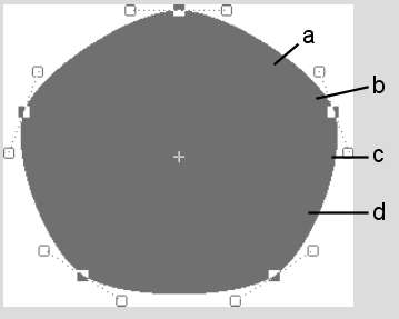 Use Edit mode to move a tangent handle and adjust the slope of the adjacent side of the polygon. When you move one tangent handle, the tangent's reciprocal handle moves in the opposite direction because handles A and B are joined to keep the joint at the intersection of the two edges smooth.