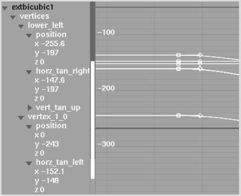 Extended bicubics have additional vertex channels that appear in the Channel Editor for subdivided vertex channels. These channels appear only when you create a keyframe for the channel and its value changes. These vertex channels are named vertex_0.1, vertex_1.0, vertex_2.1, and so on, according to their position on the surface. Click the vertex on the surface to highlight its channel in the channel hierarchy. See Warping an Extended Bicubic Surface.