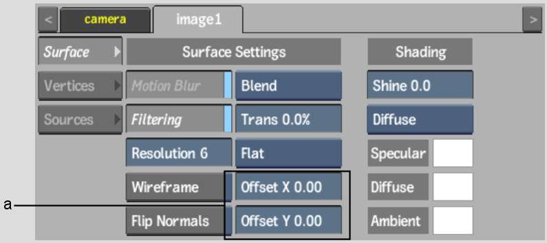 By default, a surface's axis is at the centre of the surface. Use the Off X and Off Y fields to offset a surface along the X-axis or Y-axis. All rotations, scaling, and shearing applied to a surface are applied about its axis. The location of the axis is indicated by the axis icon in the scene. See Accessing the Axis Menu.