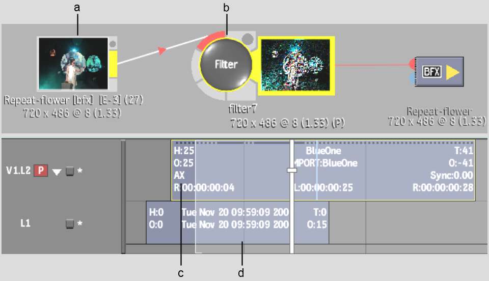 In the following illustration, the bottom layer from the EditDesk timeline is brought into a BFX level with the Pre option. Next, a layer is added to the clip’s timeline on V1.L2. An Axis Key soft effect is then added to V1.L2. A Filter node is connected to the clip in the BFX setup.