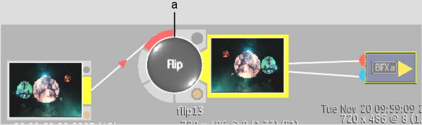 In the following illustration, the bottom layer from the clip in BFX 1 is brought into a second BFX level with the Pre option. A Flip node is then added to the clip.