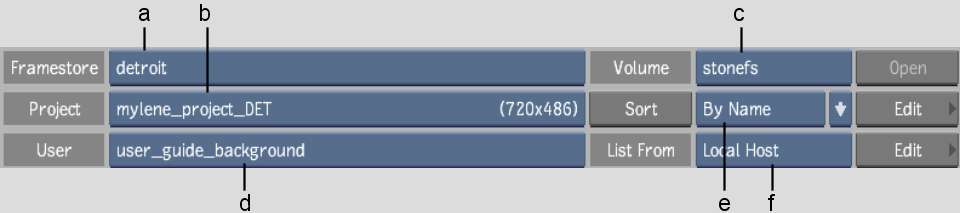 (a) Framestore box (b) Project box (c) Volume box (d) User box (e) Sort Order box (f) Host box